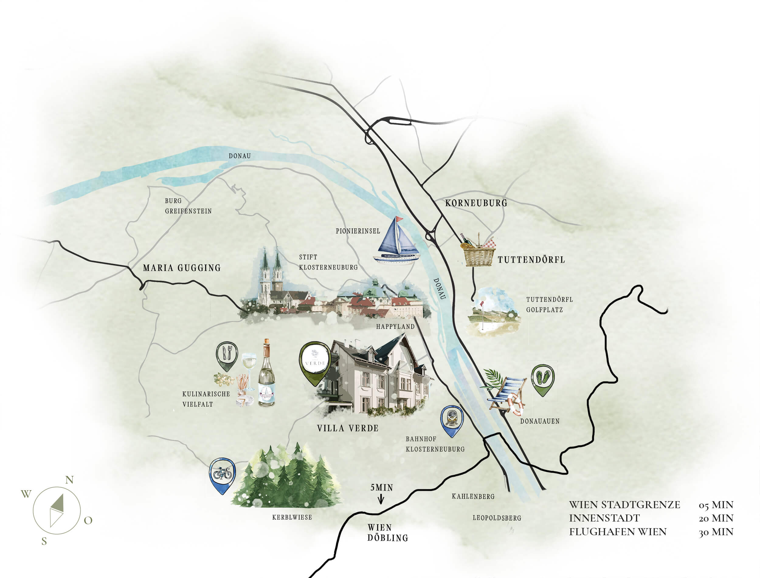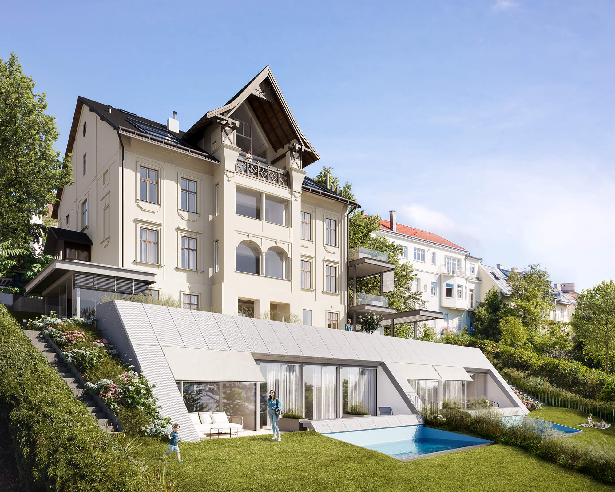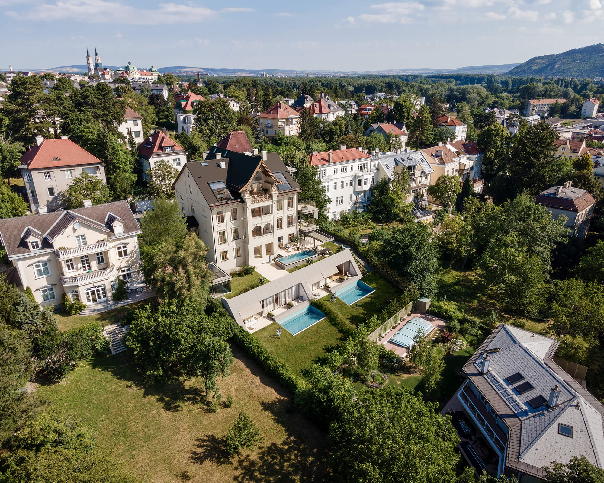Durch die außergewöhnliche Lage der Villa ist der 19. Wiener Bezirk in lediglich fünf Minuten und die Wiener Innenstadt in nur 20 Minuten zu erreichen. So bekommen die Einwohner die perfekte Balance aus Stadtnähe und Stadtferne.